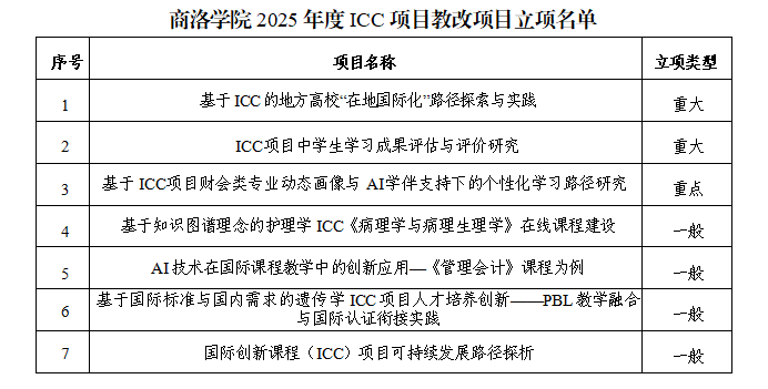 近日,中国教育国际交流研修学院发布2025年度ICC项目教学改革研究项目立项结果。全国7所开办ICC项目的高校参与申报,最终确定ICC项目教学改革研究课题拟立项36项,其中重大项目6项、重点项目10项、一般项目20项。商洛学院获批7个项目立项,其中重大项目2项。