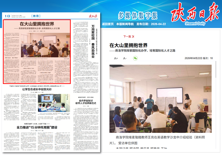 4月22日,《陕西日报》“教育”版面以《在大山里拥抱世界——商洛学院探索国际化办学、培育国际化人才之路》为题,专题介绍了我校近年来在国际化办学方面的积极探索与显著成效。